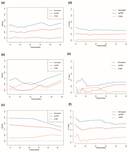 Comparison of the predictive capabilities between the current prognostic model and traditional TNM staging. Time−dependent ROC curves comparison in the training cohort (a), internal validation cohort (b), and external validation cohort (c). Time−dependent C−index curves comparison in the training cohort (d), internal validation cohort, (e) and external validation cohort (f).