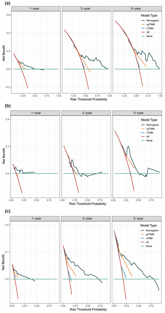 Time−dependent decision curve analysis (DCA) curves were plotted based on 1-, 3-, 5-year DFS benefit. DCA for the nomogram, cTNM and ypTNM models in the training set (a), internal validation set (b), and external validation set (c).