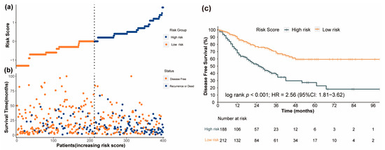 The performance of risk stratification using the prognostic nomogram model in the training cohort (“Number at risk” represents the remaining number of individuals exposed to the outcome risk at the corresponding time point). (a) The distribution and median value of the risk scores. (b) The distribution of DFS, DFS status, and risk score. (c) The Kaplan–Meier curves for the DFS of patients who were divided into high−risk and low−risk groups.