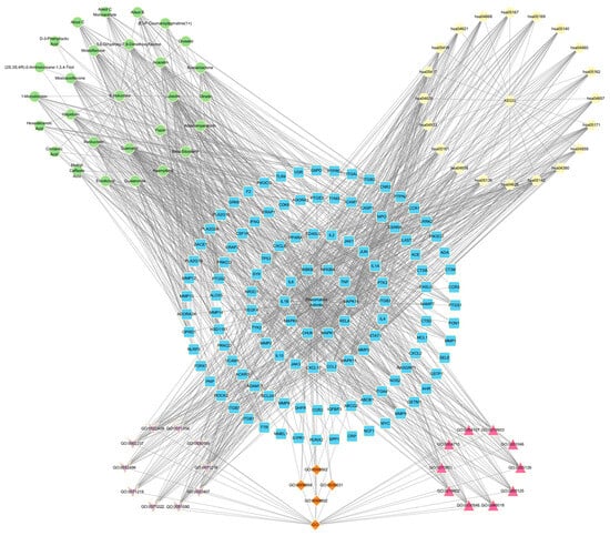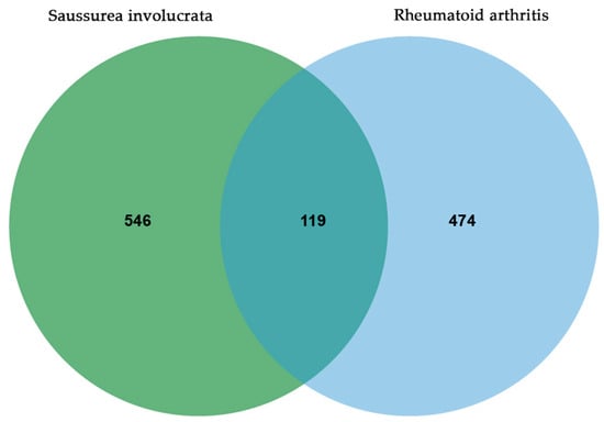 Components exert their effects on the disease by targeting specific genes. The target genes for both the components and the disease were inputted into the Bioinformatics website (www.bioinformatics.com.cn, accessed on 17 May 2023) to generate a Venn diagram [36], obtaining the intersection of targets.