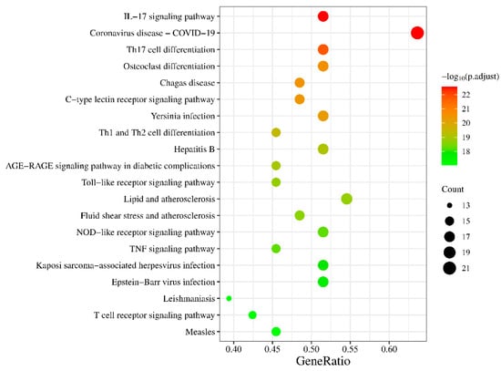 The key targets were input into the Bioinformatics website and, after screening, a total of 131 pathways with p.adjust < 0.05 were obtained. Among these pathways, the top 20 pathways with the smallest p.adjust values were selected and presented in Figure 3. The color in the plot transitions from green to red, indicating an increasing level of significance. Furthermore, the size of each circle corresponds to the number of genes enriched within the respective pathway. Larger circles signify a higher gene enrichment count.