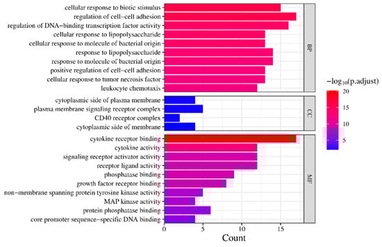 Based on the output results from the Bioinformatics website, the findings were categorized into three groups, as shown in Figure 4. In both the MF and BP analyses, multiple results met the criteria of p.adjust < 0.05. The top 10 results with the smallest p.adjust values were selected for plotting. As for the CC analysis, only four results met the requirements, and all of them were included in the plot. The plot exhibits a color gradient shifting from blue to red, indicating an increasing level of significance. Additionally, the length of each bar corresponds to the number of genes enriched within the specific category, with longer bars signifying a higher gene enrichment count.