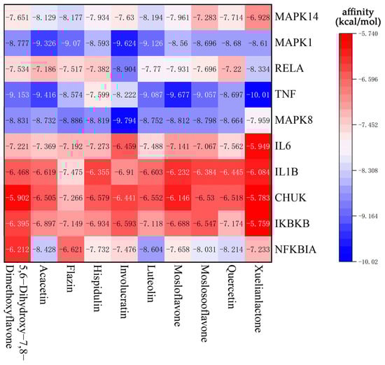 According to the network analysis results of Cytoscape, 10 compounds with the highest degree values, Quercetin, Luteolin, Acacetin, Xuelianlactone, Moslosooflavone, Hispidulin, Mosloflavone, Involucratin, 5,7-Dihydroxy-6,8-Dimethoxyflavone and Flazin were selected as molecular docking ligands (core components). Ten targets with the highest degree values, MAPK14, MAPK1, RELA, TNF, MAPK8, IL6, IL1B, CHUK, IKBKB and NFKBIA, were selected as the core targets for molecular docking. Nine protein structures were selected as the receptors, with CHUK and IKBKB targets located in different segments of the same protein structure (Table 3). The results of the molecular docking were visualized in the form of a heat map (Figure 6), where the color gradient shifting from red to blue indicates a decrease in affinity. Lower binding energy signifies a better binding activity between the ligand and receptor protein. In general, affinity values > −5 kcal/mol indicate no predicted binding, affinity < −5 kcal/mol suggests moderate predicted binding, and affinity < −7 kcal/mol suggests strong predicted binding [47]. In this section, all the selected ligands and receptors demonstrated excellent binding activity, as the lowest binding energy with the best ligand for each receptor was less than −7 kcal/mol. Notably, Xuelianlactone demonstrates the lowest affinity at −10.01 kcal/mol. In addition, the docking results of MAPK1, MAPK8, and TNF showed significantly lower binding affinities compared to the other targets (p < 0.05). However, the binding effect of IL6, ILB, CHUK, and IKBKB to each ligand is not outstanding.