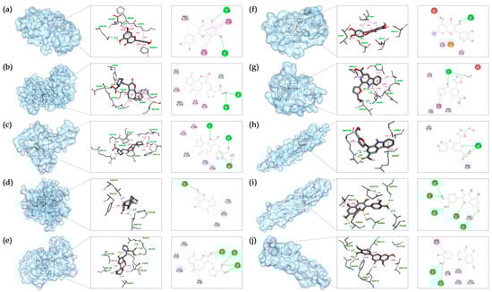 Molecular docking results in each target with the bioactive compound of SI: (a) Luteolin and MAPK14; (b) Involucratin and MAPK1; (c) Involucratin and RELA; (d) Xuelianlactone and TNF; (e) Involucratin and MAPK8; (f) Quercetin and IL6; (g) Flazin and IL1B; (h) Flazin and CHUK; (i) Quercetin and IKBKB; (j) Luteolin and NFKBIA. The images depict the binding positions of ligands within the protein, along with the surrounding residues, showcasing the interactions between the ligands and the residues. In this figure, pink, magenta, and purple dashed lines represent hydrophobic interactions, while the green dashed lines represent hydrogen bonds.