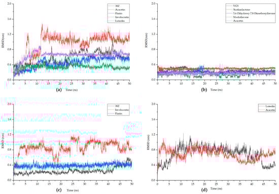 Based on the degree values obtained in network analysis and molecular docking results, the following study primarily focuses on the MAPK1 and TNF. For both targets, the top four compounds with the best docking results, as well as the original ligands (38Z and VGY) of the target proteins, were selected for MD simulations. In addition, for MAPK8, two compounds and the original ligand (38Z) were chosen for simulations. Considering the certainty of the target position, the simulation was conducted with NFKIBA as the representative target for the NF-κB pathway, focusing on the top two best-performing compounds based on the docking results. Table 5 and Figure 8 present the Root Mean Square Deviation (RMSD) values for each of these simulation combinations.