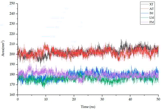 Solvent-Accessible Surface Area (SASA) quantifies the surface area of a molecule that is accessible to solvent molecules and can indicate changes in a molecule’s conformation or exposure during simulation, aiding in the assessment of binding interactions in a target protein–ligand complex. The average SASA values for complexes XT (black), AT (red), IM (blue), LM (green), and FM (purple) during MD simulation are as follows: 202.49 ± 3.72, 201.65 ± 3.17, 179.03 ± 3.25, 175.97 ± 2.59, and 179.9 ± 2.9 nm2. Throughout the entire simulation process, the SASA values of these compounds show small fluctuations, indicating their stable interaction with the protein complexes (Figure 9).