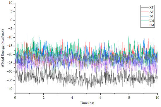 Molecular Mechanics–Poisson Boltzmann Surface Area (MMPBSA) is a method used to estimate the binding energy of a target protein–ligand complex by post-processing the MD trajectory. MMPBSA can characterize the strength and stability of the protein–ligand interaction by calculating the difference between the free energy of the bound state and the free energy of the unbound state. For the five complexes mentioned above, we selected segments with stable RMSD values and extracted 10 ns trajectories for MMPBSA energy analysis. The total binding energy (ΔG) is the sum of the change in enthalpy (ΔH) and the change in entropy (–TΔS) [49]. Using gmx_mmpbsa.py with a time interval of 10 ps, the total energy difference (ΔGtotal) between the ligand, receptor and their respective complexes in the stable phase of MD simulation was calculated, as shown in Figure 10. It can be seen from the figure that the ΔGtotal curves of each compound have small fluctuations, and the average is below −10 kcal/mol. Furthermore, by utilizing the gmx_mmpbsa.bsh script, the entropy change in each complex is calculated at a time interval of 1000 ps, allowing for the calculation of the total binding energy (ΔG). Table 6 presents the contributions of the Van der Waals force (VDW), coulomb interaction energy (COU), molecular mechanics (MM), polar solvation energy (PB) and nonpolar solvation energy (SA). The ΔH calculated by gmx_mmpbsa.bsh closely aligns with the ΔGtotal computed using gmx_mmpbsa.py. The results from both methods exhibit a close resemblance, which enhances the credibility of the computed free energy values. It can be observed from the figure and the table that ΔG and ΔH for XT are significantly lower than that of the other ligands, consistent with the results observed in molecular docking.