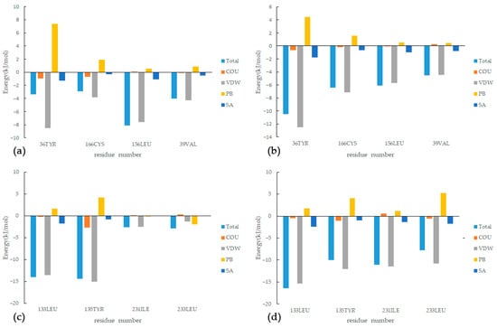 Energy decomposition of key residues: (a) IM, (b) LM, (c) XT, (d) AT.