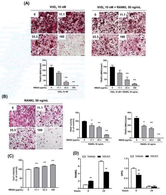 WEAG inhibits osteoclast differentiation. (A) BMMs and MLO-Y4 cells were co-cultured with or without WEAG (11.1, 33.3 and 100 µg/mL) in the presence of VitD3 (10 nM) or VitD3 (10 nM) plus RANKL (50 ng/mL) for 5 days. TRAP-stained images (upper panel; scale bar, 200 µm) and the number of TRAP-positive multinucleated cells (MNCs; lower panel) containing more than three nuclei (n = 3/group, except for 0, n = 9). (B) BMMs were treated with or without WEAG (11.1, 33.3 and 100 µg/mL) in the presence of M-CSF (60 ng/mL) and RANKL (50 ng/mL) for 4 days. TRAP-stained images (left panel; scale bar, 200 µm), the cellular TRAP activity (middle panel), and the number of TRAP-positive MNCs (right panel); n = 3/group, except for 0, n = 9. (C) The cell viability of BMMs was assessed using a CCK-8 assay after 24 h of treatment with or without WEAG (11.1, 33.3, and 100 µg/mL) in the presence of M-CSF (60 ng/mL); n = 3/group, except for 0, n = 9. (D) MLO-Y4 cells were treated with or without WEAG (100 μg/mL) and VitD3 (10 nM) for 24 h. RANKL and OPG mRNA expression levels were quantified via real-time PCR (n = 3/group). * p < 0.05, ** p < 0.01 vs. control.