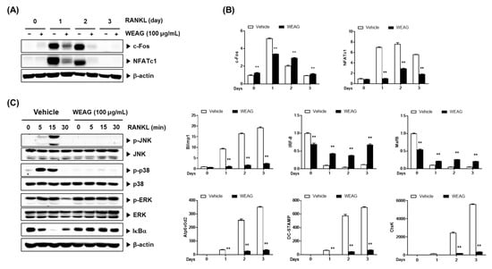 WEAG inhibits RANKL-induced signaling pathways in BMMs. (A,B) BMMs were treated with or without WEAG (100 µg/mL) and RANKL (50 ng/mL) for the indicated durations. Protein expression levels of the indicated proteins (A) and mRNA expression levels of the indicated genes (B) were assessed using Western blotting and real-time PCR (n = 3/group), respectively. (C) BMMs were stimulated with RANKL for the indicated time intervals following a 3 h pretreatment with WEAG. Protein levels of phosphorylated and non-phosphorylated forms were detected via Western blotting. ** p < 0.01 vs. control.