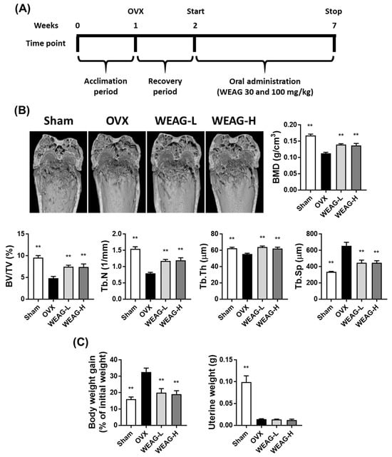 WEAG mitigates bone loss in OVX mice. (A) Schematic representation of the experimental protocols. (B,C) Sham-operated (sham) or OVX mice were orally administered with either vehicle, WEAG at a dose of 30 mg/kg (WEAG-L), or 100 mg/kg (WEAG-H) for 5 weeks. (B) µ-CT images of the distal femurs and subsequent evaluation of BMD and bone morphometric parameters in the femoral trabecular bone (n = 6/group). (C) Assessment of changes in body weight and uterine weight (n = 6/group). ** p < 0.01 vs. OVX group.