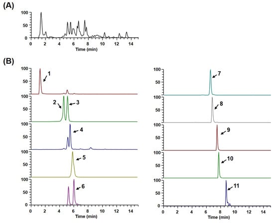 UHPLC-MS/MS analysis of WEAG. (A) Base peak chromatogram. (B) Extracted ion chromatogram of identified phytochemicals. 1, quinic acid; 2, 3-O-caffeoylquinic acid; 3, 5-O-caffeoylquinic acid; 4, caffeic acid; 5, schaftoside; 6, feruloylquinic acid; 7, quercetin-3-O-rutinoside; 8, quercetin-O-glucuronide; 9, kaempferol-3-O-glucuronide; 10, isorhamnetin-3-O-glucuronide; 11, malonyl-tri-O-caffeoylquinic acid.