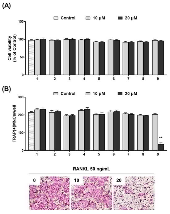 Impact of phytochemicals in WEAG on RANKL-induced osteoclast differentiation. (A) Cell viability of BMMs was assessed using a CCK-8 assay after 24 h of treatment with or without the phytochemicals (each 10 and 20 µM) in the presence of M-CSF (60 ng/mL); n = 3/group, except for 0, n = 9. (B) BMMs were treated with or without the phytochemicals (each 10 and 20 µM) in the presence of M-CSF and RANKL for 4 days. The number of TRAP(+) MNCs containing more than three nuclei (upper panel; n = 3/group) and representative images of TRAP staining treated with isorhamnetin-3-O-glucuronide (lower panel; scale bar, 200 µm). 1, quinic acid; 2, 5-O-caffeoylquinic acid; 3, caffeic acid; 4, schaftoside; 5, feruloylquinic acid; 6, quercetin-3-O-rutinoside; 7, quercetin-O-glucuronide; 8, kaempferol-3-O-glucuronide; 9, isorhamnetin-3-O-glucuronide. ** p < 0.01 vs. control.