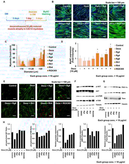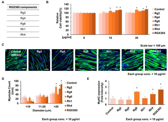 As previously proposed, RGX365 is a chemical compound composed of five constituents: Rg2, Rg4, Rg6, Rh1, and Rh4 (Figure 2A) [29]. Since we observed increased cell viability upon RGX365 treatment in vitro, we next examined the effect of each component with the efficacy of RGX365. Distinct from others, Rg6 and Rh4 remarkably elevated cell survival among the five composites (Figure 2B). Through MyHC staining of C2C12, we also found that myotubes of C2C12 treated with 10 µg/mL of Rg6 and Rh4 are thicker than those treated with other components, showing substantial amounts of myotubes whose diameter is larger than 20 µm, in comparison to the others (Figure 2C,D). Transcripts of MyHC also upregulated with the treatment of Rg6 and Rh4, indicating that though RGX365 showed the most efficacy, Rg6 and Rh4 are necessary and closely related to the function of RGX365 (Figure 2E).