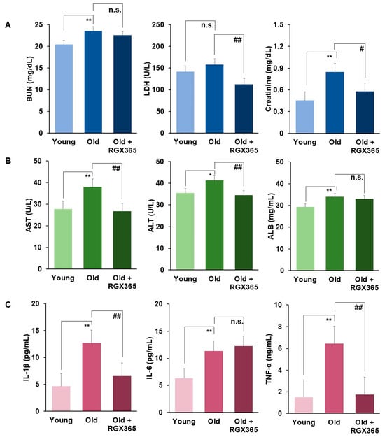 RGX365 alleviates tissue damage induced by ROS reduction. (A,B) Blood Chemistry analysis of sarcopenia mouse model. (A) Blood urea nitrogen (BUN), lactate dehydrogenase (LDH), and creatinine. (B) Aminotransferase (AST), alanine aminotransferase (ALT), and albumin (ALB). (C) Expression of proinflammatory cytokine (IL-1β, IL-6, and TNF-α) in sarcopenia mouse model. Data are mean ± SEM calculated for each group. * p < 0.05, ** p < 0.01 vs. the young group. # p < 0.05, ## p < 0.01 vs. the old group. p = n.s. (non-significant) vs. old group (One-way ANOVA with Tukey’s correction.) Each experiment was triplicated, after which the results were recorded and calculated.