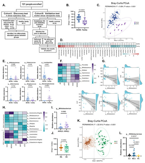 Gut microbial composition at the genus level and clinical relevance in RA patients and healthy controls of two cohorts. (A) A flow diagram depicting the enrollment and analysis of RA patients and healthy individuals. (B) Chao 1 index of the NORA cohort was significantly higher in RA patients compared to their relatives (p < 0.001). (C) Bray–Curtis-based PCoA analysis revealed significant differences in microbial community structure between the patients and their family members, with fewer individual differences in the NORA group. (D) The 34 highly expressed differential genera identified by the quasi-paired cohort method (Wilcoxon signed-rank test) for each subject. The color bar indicates the Z score-normalized abundance (scaled by row); green and red names represent low and high expression, respectively. (E) Relative abundance of 6 highly expressed differential genera. Bifidobacterium was found to be significantly depleted in RA patients. (F) List of highly expressed species and their correlation with clinical markers of systemic inflammation and titers of autoantibodies. (G) The correlation between Bifidobacterium and clinical parameters was computed by using Pearson’s correlation coefficient. (H) List of AKA-associated species and their correlation with clinical markers. (I) Abundance of Bifidobacterium in AKA (−) and AKA (+) subgroups. (J) Chao 1 index of clinical cohort II was significantly higher in RA patients compared to healthy controls. (K) Bray–Curtis-based PCoA analysis of clinical cohort II. (L) Abundance of Bifidobacterium in the 3 groups. Values are presented as means ± SEM. Unpaired t-tests were used for comparisons between the 2 groups. One-way ANOVA and Bonferroni’s multiple comparisons test were performed between multiple groups. The colored bar indicates Spearman’s coefficients: purple, p > 0, positive correlation; green, p < 0, negative correlation. The pair with a p < 0.05 was selected. Significant results are indicated as: * p < 0.05, ** p < 0.01.
