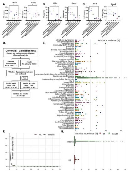 Co-culture experiments to identify specific Bifidobacterium strains and validate their function in the metagenomes database. (A–C) ELISA assay for the expression levels of TNF-α, IFN-γ, and IL-17A in culture supernatants of LPS-stimulated IEC-6 and Caco-2 cells were treated with 5 different Bifidobacterium strains. B. pseudocatenulatum significantly inhibited inflammatory cytokine secretion. Values are presented as means ± SD. A one-way ANOVA was used to compare values among multiple groups. Significant results are indicated as: * p < 0.05, **** p < 0.001, ns, non-significant. (D) Another validation cohort based on information from the metagenomes database of RA patients and healthy individuals. (E) Boxplot of the relative abundance of B. pseudocatenulatum in GMrepo, which was expressed in the healthy group above all disease groups. (F,G) Relative abundance of B. pseudocatenulatum in RA patients and healthy individuals verified in GMrepo.