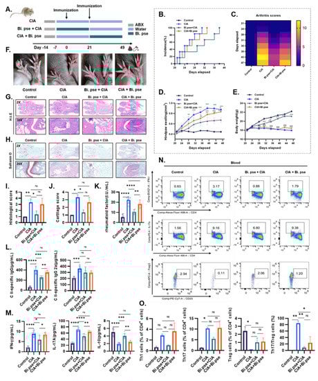 One schedule of the experiment: daily oral administration with 0.2 mL B. pseudocatenulatum cocktail (OD600 of 1.0, corresponding to 1 × 109 CFU) was given to the prevention group (Bi.pse + CIA, n = 6) for 21 days starting on day 7 before the first immunization. The treatment group (CIA + Bi.pse, n = 6) was given B. pseudocatenulatum cocktail after the booster immunization for 21 days through daily oral gavage. Meanwhile, controls and CIA mice were treated with saline through oral gavage during the whole trial.