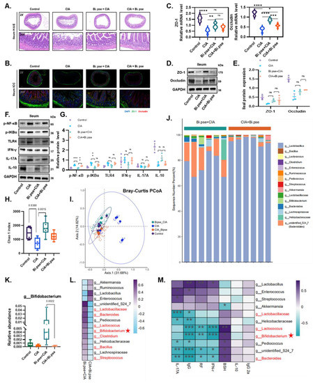 B. pseudocatenulatum protects intestinal barrier function and reshapes the gut microbiota. (A) Histopathological changes in ileum tissues with HE staining (scale bars set at 50 and 500 μm). (B) Immunofluorescence-stained sections of ileum using antibodies against ZO-1 (green) and Occludin (red) with DAPI (blue) as the counterstain (scale bars set at 50 and 500 μm). (C) Quantitative RT-PCR and (D,E) Western Blot showing expression of ZO-1 and Occludin. (F) Representative Western Blot image and (G) analysis of the alternative NF-κB signaling pathway. (H) Alpha-diversity analysis (Chao 1 index) of fecal microbiota OTU at various taxonomic ranks. (I) PCoA of β-diversity based on the Bray–Curtis dissimilarity matrix of OTU-level compositional profiles. (J) The gut microbial composition profiles at the genus level. (K) Abundance of Bifidobacterium in the 4 groups. (L) Heatmap of differentially abundant bacterial OTUs using one-way ANOVA, at p < 0.05. BSH-enriched genera are marked in red; green and purple names represent low and high expression, respectively. (M) Associations of the abundance of differential genera with serum cytokines. The colored bar indicates the Spearman’s coefficients: purple, p > 0, positive correlation; blue, p < 0, negative correlation. Red font indicates BSH-enriched genus. Values are presented as means ± SEM. One-way ANOVA and post-hoc Dunnett’s test were performed between multiple groups. Significant results are indicated as: ns: not significant, * p < 0.05, ** p < 0.01, *** p < 0.001, **** p < 0.001.