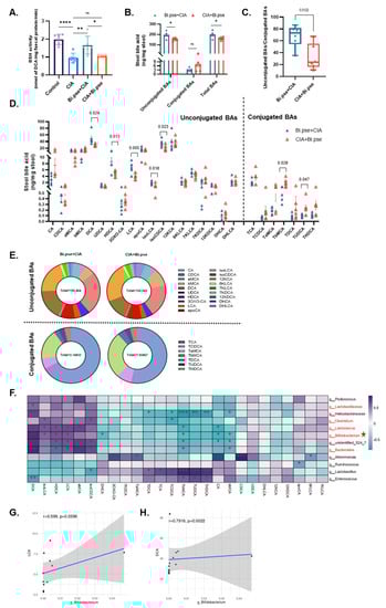 3.5. B. pseudocatenulatum Prophylactic Intervention Enhanced BSH Activity and the Accumulation of Unconjugated Secondary BAs