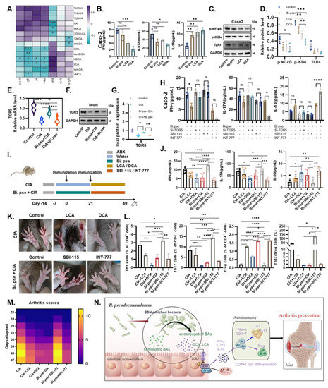 B. pseudocatenulatum-promoted DCA inhibits the alternative NF-κB pathway by regulating TGR5 receptor expression. (A) Heatmap of positive (purple) and opposite (blue) correlation between BAs and cytokines. (B) The expression levels of IFN-γ, IL-17A, and IL-10 in culture supernatants of LPS-primed Caco-2 cells treated with B. pseudocatenulatum, LCA, and DCA. (C,D) Western blot shows the expression of NF-κB signaling pathway molecules. (E) Quantitative RT-PCR and (F,G) Western blot showing expression of ileum TGR5. (H) INT-777, a semi-synthetic TGR5 agonist, greatly enhanced the effect of B. pseudocatenulatum in inhibiting IL-17A and promoting IL-10 in LPS-stimulated Caco-2 cells. SBI-115, a TGR5 inhibitor, and si-TGR5 offset the inflammatory homeostatic effect of B. pseudocatenulatum. (I) Flow chart showing another experimental treatment design. (J) The concentrations of pro-inflammatory factors IFN-γ and IL-17A, and the anti-inflammatory factors IL-10 in mice serum were determined by ELISA. (K) Representative images of paws in each group before sacrifice. (L) FCM analysis of the percentage of Th1 (CD4 + IFN-γ +), Th17 (CD4 + IL-17A+), Treg (CD4+CD25+foxp3+) cells, and ratio of Treg/Th17 in blood of mice. (M) Arthritis clinical scores of CIA mice. (N) Graphical abstract of this study. Based on the interactions of the gut–joint axis, B. pseudocatenulatum increased the levels of unconjugated secondary bile acids and protected the intestinal barrier to activate the TGR5-mediated immune response, preventing RA symptoms. Values are presented as means ± SD. One-way ANOVA and post-hoc Dunnett’s test were performed between multiple groups. Significant results are indicated as: ns: not significant, * p < 0.05, ** p < 0.01, *** p < 0.001, **** p < 0.001.