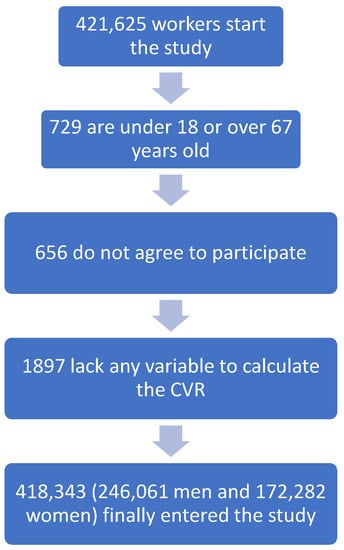 Cross-sectional study of 418,343 workers (172,282 women and 246,061 men) belonging to different autonomous communities in Spain (Balearic Islands, Andalusia, Canary Islands, Valencian Community, Catalonia, Madrid, Castilla La Mancha, Castilla León, Basque Country) and from different employment sectors, especially hospitality, construction, trade, health, public administration, transport, education, industry and cleaning. The study was carried out between January 2019 and June 2020. The workers were selected from those who underwent periodic occupational medical examinations.
