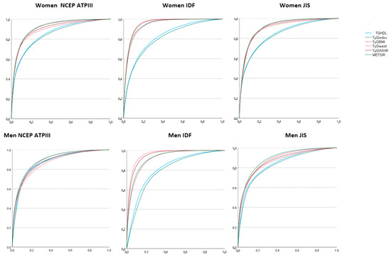 Figure 2 and Table 5 show the results of the ROC curves, noting that the areas under the curve, in both women and men, are very large for most risk scales for insulin resistance, obtaining the following values: worse results for triglycerides/HDL and the TyG index. The largest areas under the curve were obtained when the IDF criteria for metabolic syndrome were applied and when we referred to the IR scales that included waist circumference in their calculation, that is, the TyG index-BMI and the TyG index-waist/height.