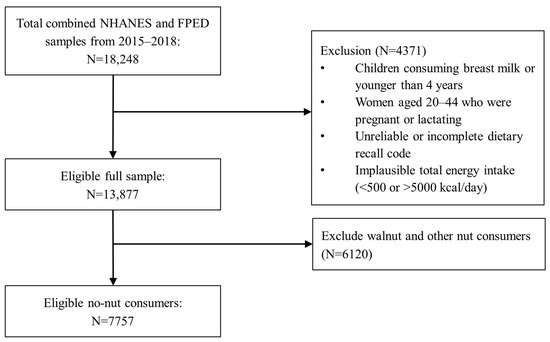 The National Health and Nutrition Examination Survey (NHANES) is a nationally representative, cross-sectional survey of U.S. non-institutionalized civilian residents. NHANES data are collected by the National Center for Health Statistics of the Centers for Disease Control and Prevention. Written informed consent was obtained for all participants or their proxies, and the survey protocol was approved by the Research Ethics Review Board at the National Center for Health Statistics. Dietary data were obtained from two NHANES cycles: 2015–2016 and 2017–2018. Children consuming breast milk or younger than 4 years, women aged 20–44 years who were pregnant or lactating, respondents with unreliable food recall data, and individuals reporting implausibly low (<500 kcal/d) or high (>5000 kcal/d) caloric intakes were excluded from the study [12]. Previous studies indicated that tree nut consumption increased in recent times and was associated with improved diet quality with a wide range of health benefits [13,14]. Given this knowledge of improved diet quality among nut consumers, we are focusing on no-nut consumers in this study; therefore, nut consumers were excluded in the modeling analyses. The sample of no-nut consumers included 2670 children and adolescents (age 4–18 years) and 5087 adults (19 years and older), as summarized in Figure 1.