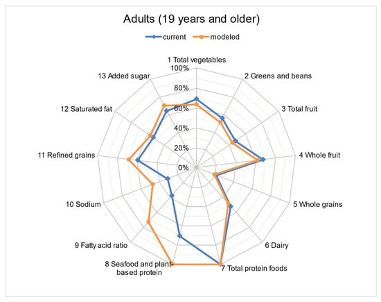 Radar plot to compare HEI-2015 * component scores (% of maximum possible score) between current intake and modeled intake (addition of 1 ounce of walnuts) among children aged 4–18 years. * HEI-2015 includes 13 dietary components. Nine adequacy components (those recommended for inclusion in a healthy diet) include total vegetables (5), greens and beans (5), total fruits (5), whole fruits (5), whole grains (10), dairy (10), total protein foods (5), seafood and plant proteins (5), and fatty acids ratio (10). Four moderation components (those that should be consumed sparingly) include sodium (10), refined grains (10), saturated fats (10), and added sugars (10) (21).