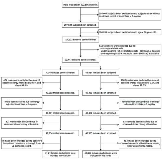 A total of 502,505 subjects were examined at baseline. We excluded subjects who had an incomplete iron intake record or iron intake ≤0 mg/day, were <60 years of age, missing metabolic rate data, under- or over-reporting energy intake (under-reporting: <1.1 × metabolic rate—500 kcal; over-reporting: 2.5 × metabolic rates + 500 kcal); energy-adjusted iron intake ≤0 mg/day; stroke and dementia at baseline; or a missing follow-up dementia record. After exclusion criteria were applied, a remaining 41,213 male and 48,892 female subjects were eligible for analysis.