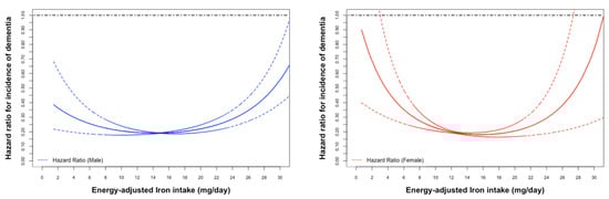Cox proportional risk regression models estimated continuous hazard ratios (HR) for dementia associated with energy-adjusted iron intake. This analysis was conducted in males and females separately.