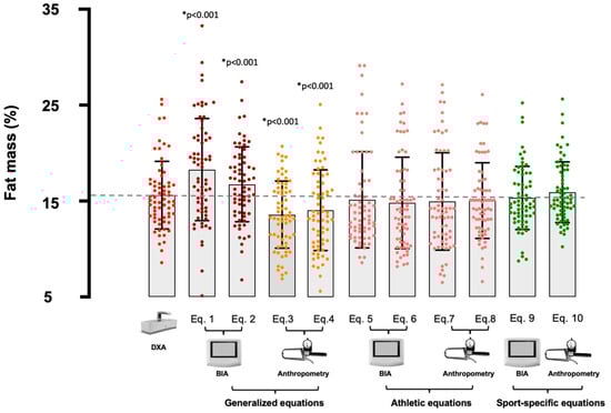 - López-Taylor, J.R.; González-Mendoza, R.G.; Gaytán-González, A.; Jiménez-Alvarado, J.A.; Villegas-Balcázar, M.; Jáuregui-Ulloa, E.E.; Torres-Naranjo, F. Accuracy of anthropometric equations for estimating body fat in professional male soccer players compared with DXA. J. Sport. Med. 2018, 2018, 6843792. [Google Scholar] [CrossRef]