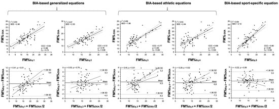 | Stewart et al. [26] | (1) FM (g) = 429.4 × Wt − 283.6 × (S2/R) − 73.1 × Xc − 134.1 (2) FM% = (FMg/1000)/Wt × 100 | 82 male athletes of different sports (cycling, racket sports, rowing, rugby, running, strength sports, and triathlon) | Foot-to-hand BIA at 50 kHz vs. DXA | |