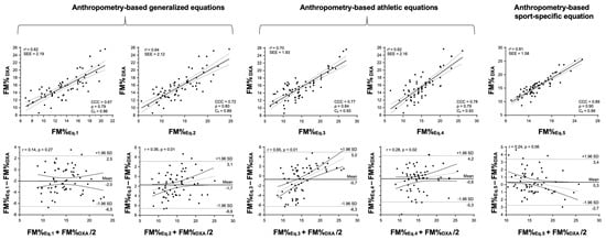 | Evans et al. [27] | FM% = 8.997 + 0.24658 × (3SKF) − 6.343 × (gender) − 1.998 × (race) | 132 male and female athletes of different sports (football, basketball, volleyball, gymnastics, swimming, and track, and field) | Manual anthropometry vs. 4C modeling | 3SKF = sum of abdomen, mid-thigh, and triceps skinfolds; gender coded as 0 = female, 1 = male and race coded as 0 = white, 1 = black |