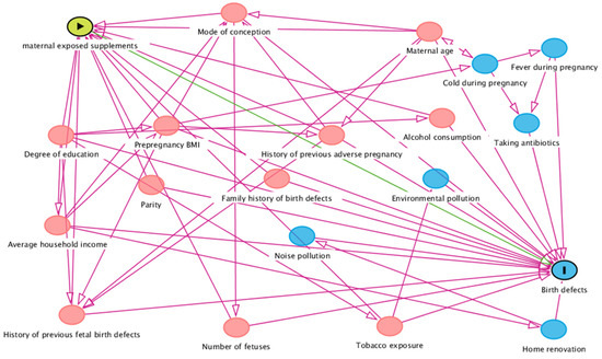 Directed acyclic graph based on supplements exposure and birth defects outcomes. Red circles represent variables included in the present statistical analysis and blue circles represent variables not included in the present statistical analysis. Right arrow in the yellow circle represent exposure factors, the vertical line in the blue circle represent outcome variable, the green line represent direct causal path.