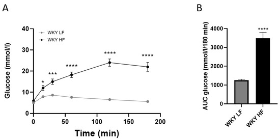 OGTT (A) and corresponding AUC (B) measured in WKY on LF diet and on HF diet before the treatment (60 weeks of age). Data are presented as means ± S.E.M. Statistical analysis was performed by t-test or two-way ANOVA with Bonferroni’s post hoc test. AUC area under the curve. Significance is * p < 0.05, *** p < 0.001, **** p < 0.0001 vs. WKY LF (n = 8).
