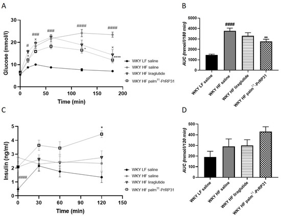 Similar to 60-week-old WKY HF rats before the treatment, 66-week-old WKY HF saline rats again showed strong glucose intolerance in the OGTT, compared to WKY LF saline rats at the end of the experiment (Figure 4). Palm11-PrRP31 treatment very significantly lowered the glucose area under the curve in the OGTT (Figure 4B). The insulin area under the curve did not differ among the experimental groups (Figure 4D).