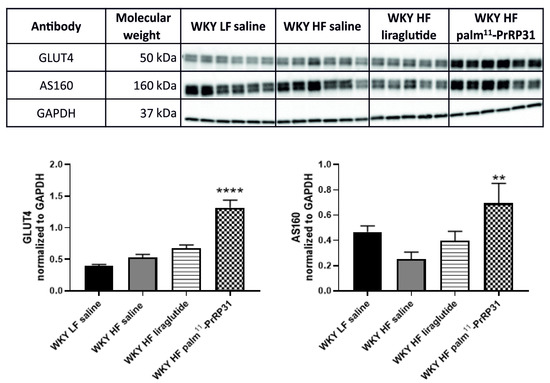 Chronic effect of palm11-PrRP31 and liraglutide on glucose metabolism measured by western blot in eWAT at the end of the experiment (66 weeks). Data are presented as means ± S.E.M. Statistical analysis was performed by one-way ANOVA with Dunnett´s post hoc test. IRS1 insulin receptor substrate 1, AS160 Akt substrate of 160 kDa, GLUT4 Glucose transporter 4. Significance is ** p < 0.01, **** p < 0.0001 WKY palm11-PrRP31 vs. WKY HF saline (n = 5–6).