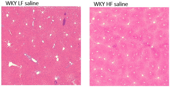 As shown in Table 3, WKY HF saline rats and WKY LF saline rats had surprisingly similar liver weights. No treatment affected liver weight. Regarding liver histology, no accumulation of fat droplets or liver steatosis was detected in either WKY LF saline or WKY HF saline rats (Figure 7).