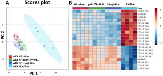 (A) PCA score plot based on lipid profiling of WKY LF saline, WKY HF saline, WKY HF liraglutide and WKY HF palm11-PrRP31 rats. (B) Heatmap of top 20 lipid features based on one-way ANOVA rankings.