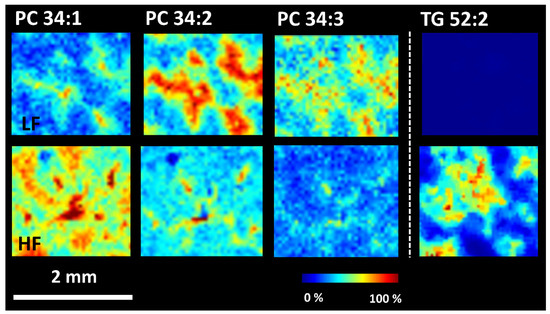 MALDI MSI analysis of WKY rats on LF and HF diet. Ion images of phophatidylcholines (PC 34:2, m/z 796.5; PC 34:1, m/z 798.5, [M + K]+) and triacylglycerol (TG 52:2, m/z 897.7, [M + Na]+) were obtained in positive ion mode at spatial resolution 40 μm.