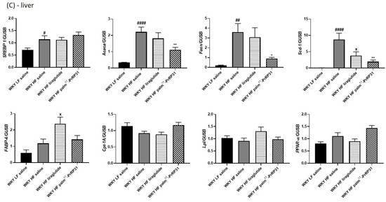 Regarding lipogenesis in adipose tissue, the mRNA expression of Scd-1 was increased in both iWAT and eWAT, while that of SREBP-1 was higher only in eWAT of WKY HF saline rats, rather than WKY LF saline rats. Peroxisome proliferator-activated receptor γ (PPAR-γ) mRNA expression was higher in WKY HF saline than in WKY LF saline in both eWAT and iWAT. The mRNA expression of FABP-4 and Cpt-1a, genes involved in lipolysis, was increased in eWAT only. Liraglutide treatment decreased the mRNA expression of Scd-1 in iWAT, while palm11-PrRP31 treatment had no effect on lipogenesis-related genes mRNA expression in adipose tissue (Figure 10A,B).