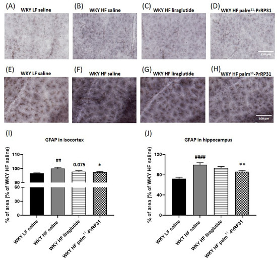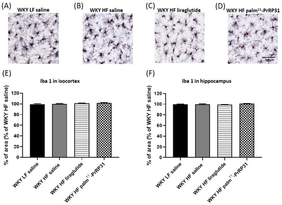 The photomicrographs of immunohistochemically stained brain sections (Figure 11) show that WKY HF saline had a higher GFAP reactivity than WKY LF saline in both the isocortex and hippocampus. The percentage of the cortical and hippocampal areas stained for the astrocyte marker GFAP was significantly reduced after treatment with palm11-PrRP31. Liraglutide treatment tended to reduce astrocytosis in the isocortex (p = 0.075), but not in the hippocampus. Immunohistochemical staining for Iba 1, a marker of both resting and activated microglia (Figure 12), shows no visible clusters of activated microglia in any experimental group.