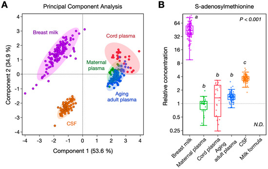 One−carbon metabolite profiling in biofluids and milk formula. One-carbon metabolite concentrations were measured in breast milk (purple, n = 142), cord blood plasma (red, n = 23), maternal plasma (green, n = 28), aging adult plasma (blue, n = 91), CSF (orange, n = 92), and milk formula (n = 11). (A) PCA score plot based on metabolite concentrations in the different biofluids; shaded areas show 95% confidence regions. (B) Boxplot of SAM concentration in biofluids and milk formula relative to the median values for the maternal plasma samples shown with logarithmic Y-axis. Kruskal–Wallis test with post hoc Dunn method was applied; groups not connected by the same letter show statistical differences (p < 0.05). CHO, choline; BET, betaine; MET, methionine, SAM, S-adenosylmethionine; SAH, S-adenosylhomocysteine; CYS, cystathionine; tHCY, total homocysteine; CSF, cerebrospinal fluid; N.D., not detected.