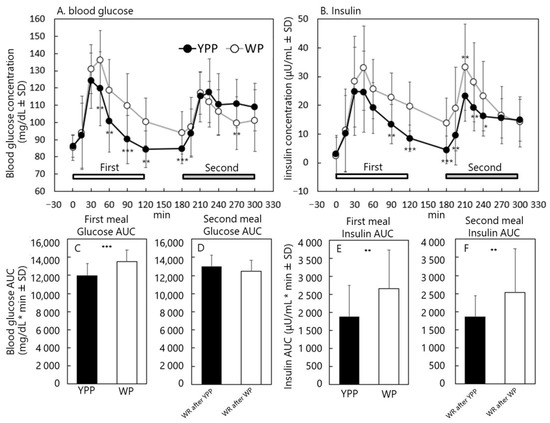 Postprandial blood glucose levels were significantly lower in subjects who ate YPP at 45, 60, 90, 120, and 180 min. In contrast, with YPP consumed as the first meal, the postprandial blood glucose level was significantly higher at 270 min when WR was consumed as a second meal at 180 min (Figure 2A). Insulin levels were significantly lower with YPP treatment at 90, 120, and 180 min. Furthermore, with YPP consumed as the first meal, postprandial insulin levels were significantly lower at 195, 210, 225, and 240 min when WR was consumed as a second meal at 180 min (Figure 2B). The AUC of blood glucose during the first meal was significantly lower when YPP was consumed (Figure 2C). There was no significant difference in the blood glucose AUC of the second meal between subjects who consumed YPP and those who consumed WP for the first meal (Figure 2D). YPP intake was significantly lower than that in both the first and second meals (Figure 2E,F).