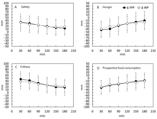 Assessment of satisfaction, hunger, and how much more individuals could eat after the first meal of YPP or WP of the same weight using the VAS method. A questionnaire using a 100 mm Visual Analogue Scale (VAS) was used to evaluate the results at 30, 60, 90, 120, 150, and 180 min from the start of YPP or WP intake. The four questions asked included: (A) how satisfied the subjects felt (about food or eating); (B) how hungry they were; (C) how full they were; and (D) how much they could eat if they were to eat at that moment.