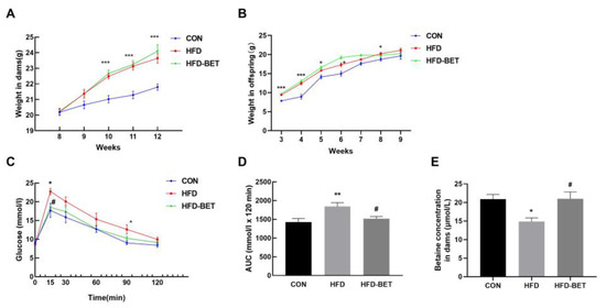 Body weight in dams and offspring mice and the GTT in dams. (A) Body weight in dams; (B) body weight in offspring mice; (C) serum glucose levels for the GTT in dams; (D) the AUC for the GTT in dams; (E) serum betaine levels in dams. Data are presented as the means ± SEM. * p < 0.05, ** p < 0.01 and *** p < 0.001 for the HFD group vs. the CON group; # p < 0.051 for the HFD-BET group vs. the HFD group. Abbreviation: CON group, control diet group; HFD group, high-fat diet group; HFD-BET group, high-fat diet + 1% betaine group.