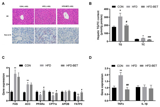 Maternal betaine supplementation attenuated NAFLD in offspring mice under MHFD. (A) Hematoxylin–eosin (H&E)- and oil red O-stained liver sections; (B) hepatic concentrations of TG and TC; (C) the mRNA expression of genes related to hepatic lipid metabolism; (D) the mRNA expression of genes related to hepatic inflammation. Data are presented as the means ± SEM. * p < 0.05 and ** p < 0.01 for the HFD group vs. the CON group; # p < 0.05, ## p < 0.01 and ### p < 0.001 for the HFD-BET group vs. the HFD group. Abbreviation: CON group, control diet group; HFD group, high-fat diet group; HFD-BET group, high-fat diet + 1% betaine group; TG, triglyceride; TC, total cholesterol.