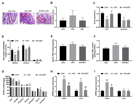 Effects of maternal betaine supplementation on intestinal barrier integrity and levels of gut flora-related metabolites. (A) Hematoxylin–eosin (H&E)-stained colon sections; the red box refers to a crypt, and the red arrow refers to a goblet cell; (B) histopathological score of colon; (C) the mRNA expression of ZO-1 and Occludin in the colon; (D) one-carbon metabolites content in the serum; (E) TBA content in the serum; (F) TBA content in the liver; (G) SCFAs content in the cecal; (H,I) the mRNA expression of GPR41/43 in the colon and liver. Data are presented as the means ± SEM. * p < 0.05, ** p < 0.01 and *** p < 0.001 for the HFD group vs. the CON group; # p < 0.05 and ## p < 0.01 for the HFD-BET group vs. the HFD group. Abbreviation: CON group, control diet group; HFD group, high-fat diet group; HFD-BET group, high-fat diet + 1% betaine group; TMAO, trimethylamine-n-oxide; TBA, total bile acid; SCFAs, short-chain fatty acids.