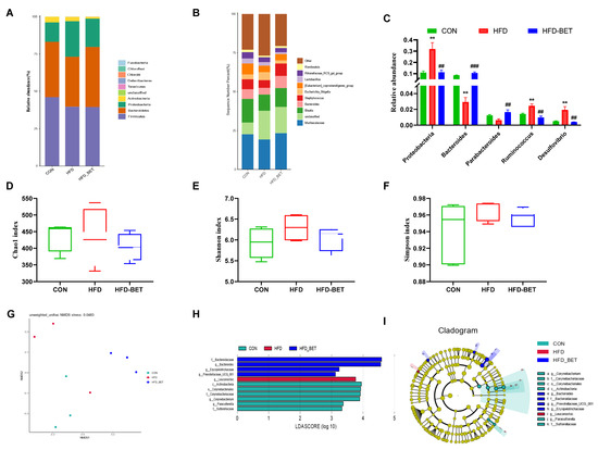 Effects of maternal betaine intake on gut microbiota in offspring mice. (A) Taxonomic composition distribution at the phylum level; (B,C) taxonomic composition distribution at the genus level; (D–F) alpha diversity analysis; (G) non-metric dimensional scaling (NMDS) analysis; (H,I) linear discriminant analysis effect size (LEfSe) analysis, and the linear discriminant analysis (LDA) score using a threshold score larger than 2.0. Data are presented as the means ± SEM. ** p < 0.01 for the HFD group vs. the CON group; ## p < 0.01 and ### p < 0.001 for the HFD-BET group vs. the HFD group. Abbreviation: CON group, control diet group; HFD group, high-fat diet group; HFD-BET group, high-fat diet + 1% betaine group.